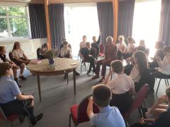 On our re-entry to the Meeting Room the children heard how Quaker worship is conducted and a boy volunteered to act as an elder sitting by the meeting member. We then settled for a short period of silence during which several children stood to minister, remembering to leave a gap between their ministries. At the end the two 'elders' shook hands and the class followed suit. The children were impressive in the way the participated and listened to what they were told. Their questions were intelligent and thoughtful. We hope they enjoyed their visit. It was certainly a pleasure to host them.